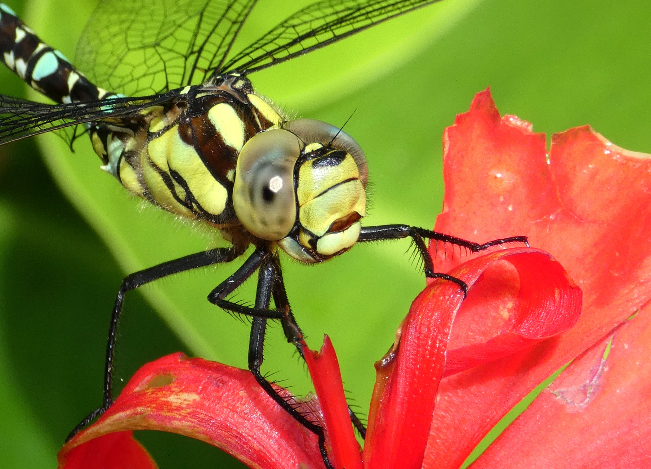 Fijn dat hij aan een Canna ging hangen, dat zorgt voor een kleurrijke foto zonder drukke achtergrond.