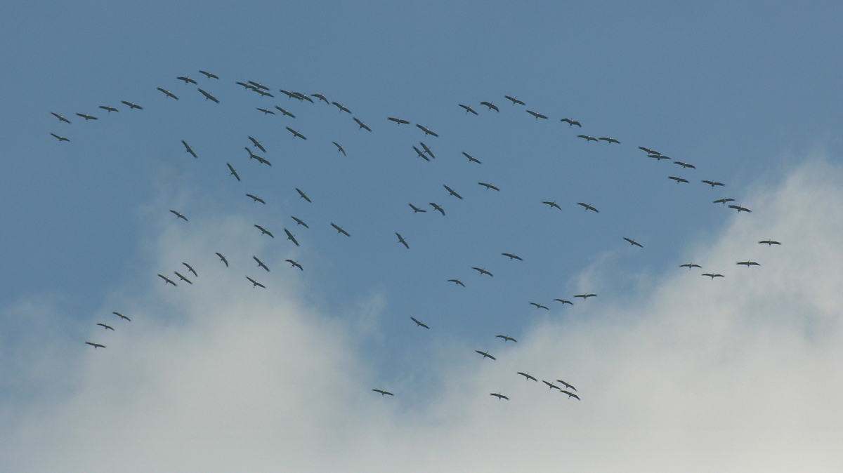Ik was net op tijd weer buiten want inmiddels was het geluid, zeg maar gerust flinke herrie recht boven ons huis en het was een groep Kraanvogels. In het voorjaar had ik ze ook over zien vliegen en daar herkende ik het geluid dus van.