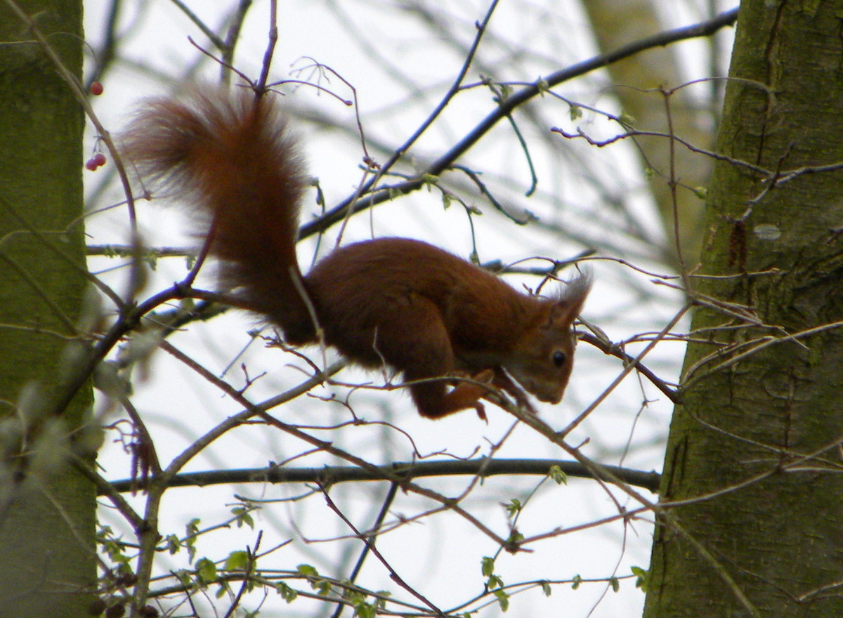 Deze Eekhoorn had mij niet in de gaten, dat komt niet vaak voor … meestal is het andersom. Ik durfde daarom niet een stap opzij te doen om die tak niet in beeld te hebben want dan verraad ik mezelf.
