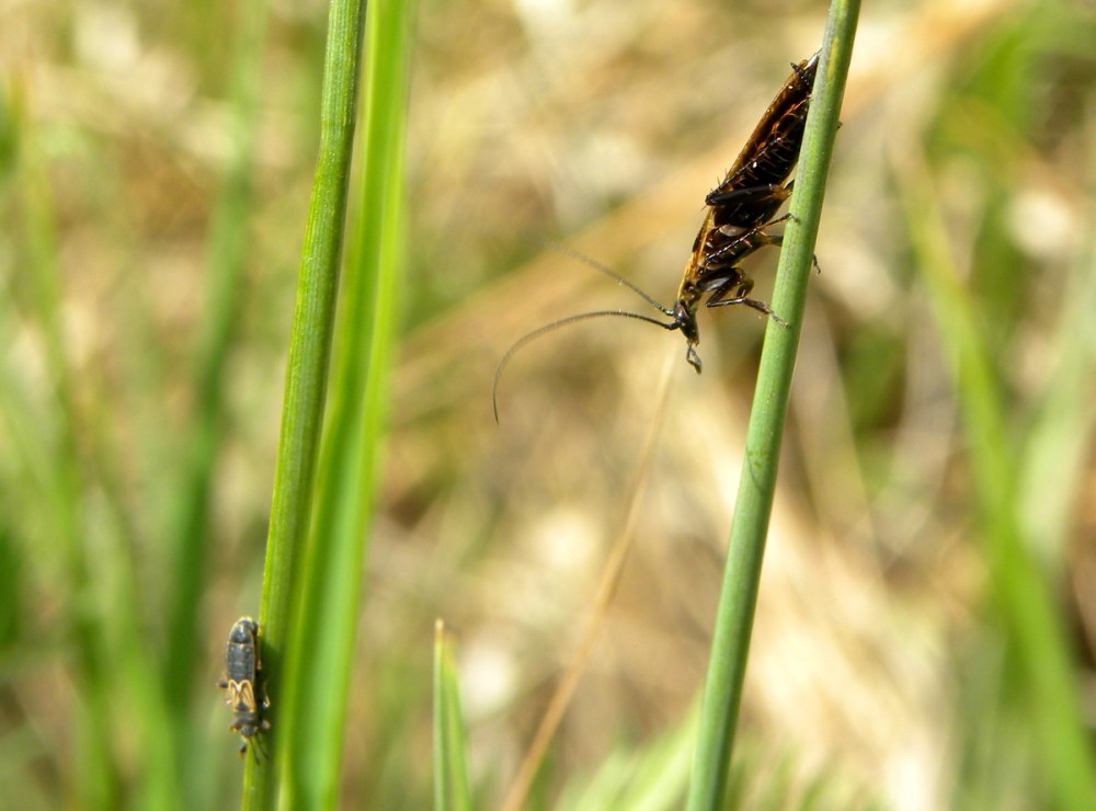 Aan de tuin zijn we nog lang niet toe wat inhoud dat er heel veel hoog gras en onkruid groeit. Helemaal niet erg en gek genoeg ook niet lelijk want veel onkruid heeft mooie bloemen. Het leukste van alles is nog wel dat er op elke vierkante meter heel veel beestjes voorkomen. Zonder overdrijven …. honderden nimfjes van de Greppelsprinkhaan