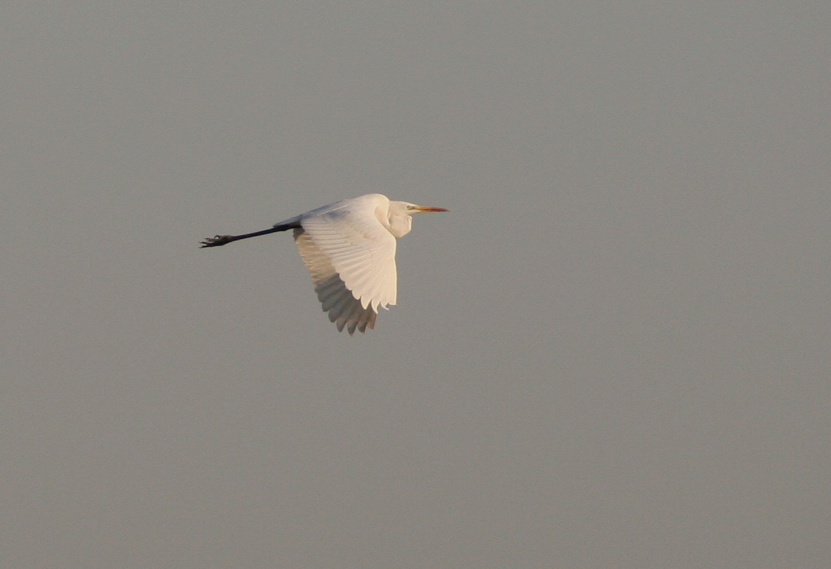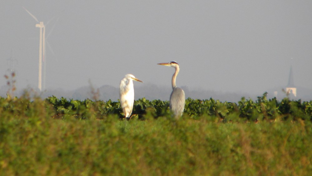 De kraanvogels waren nog maar net weg toen ik in de verte iets groots en wits zag vliegen … dat is een grote zilverreiger zegt Bert. We zijn het beest dat vergezeld (of beter gezegd belaagd) werd door een blauwe reiger, steeds dichter genaderd. De foto’s zijn echter toch nog van grote afstand genomen.
