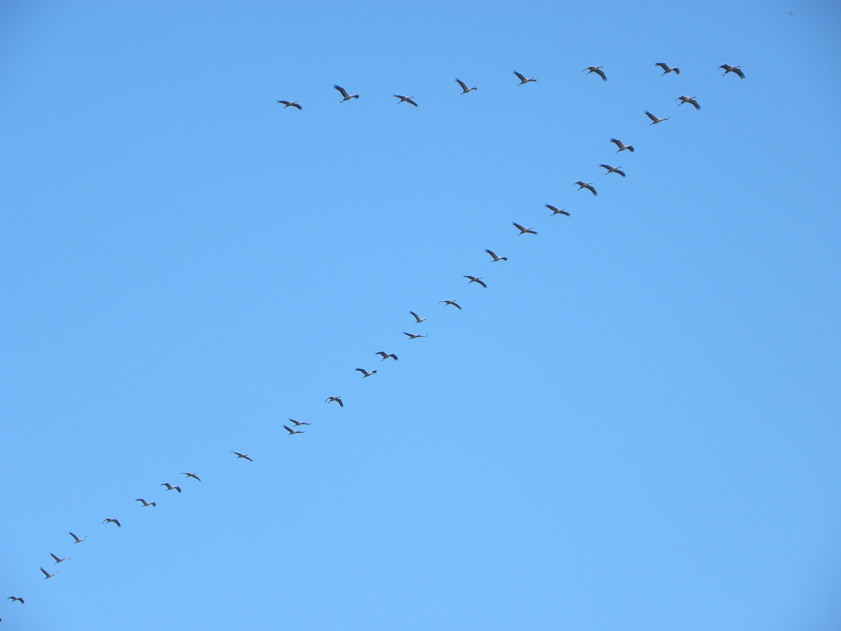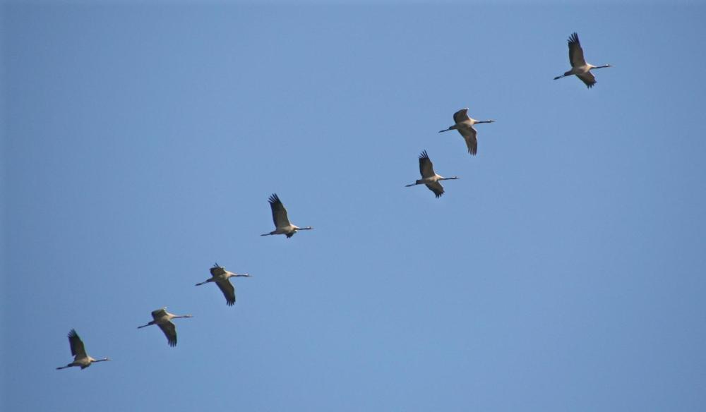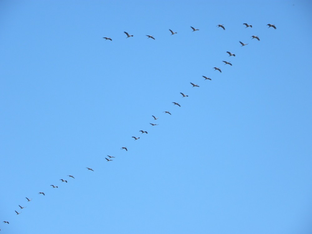Mijn man zei ga maar mee wandelen, ik zie je straks …. en dat was een goed idee want even later zie ik in de verte een aardige groep kraanvogels naderen.
