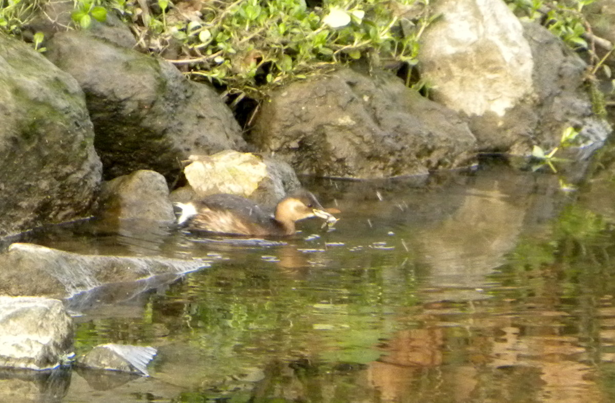 Aan dierenleven heb ik niet veel gezien … te veel wandelaars denk ik. Vlak voor ik in de auto wilde stappen zag ik naast een hoop eenden een heel klein beestje, een dodaars met een vis.