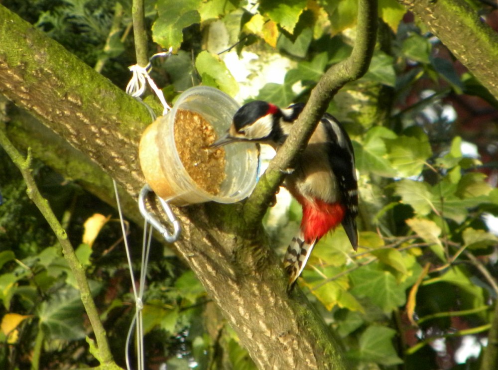 Het bakje hangt op een plek waar ook een tak zit, zodat vogels die niet gaan hangen er ook wat aan hebben, zoals de roodborst, eksters EN … een grote bonte specht.
