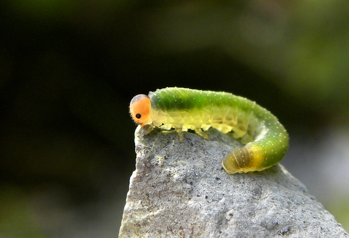Op een steentje zit een larve van een bladwesp onbekend, de weg te zoeken naar een lekker blad.