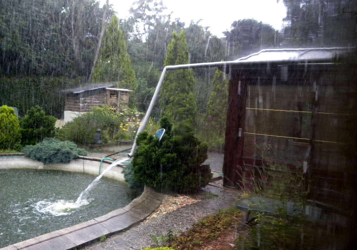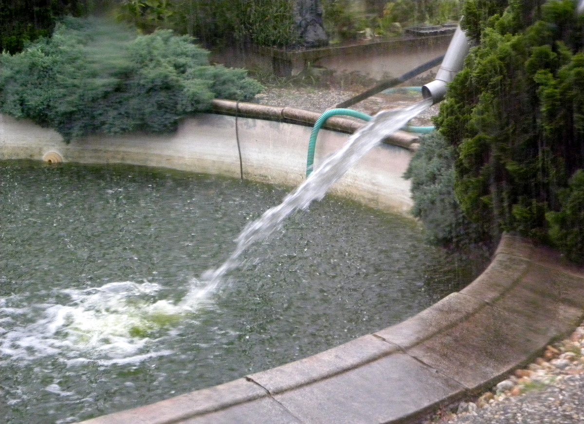 Ik hoorde het al een tijdje rommelen op de achtergrond en daarom had ik al maatregelen genomen. Een extra regenpijp aangesloten op die wat van het dak komt en deze hangt dan boven de vijver zodat er weer eens vers water bijkomt. Bovendien is er veel water verdampt de afgelopen tijd met die hitte en kon het peil wel weer eens wat hoger worden.