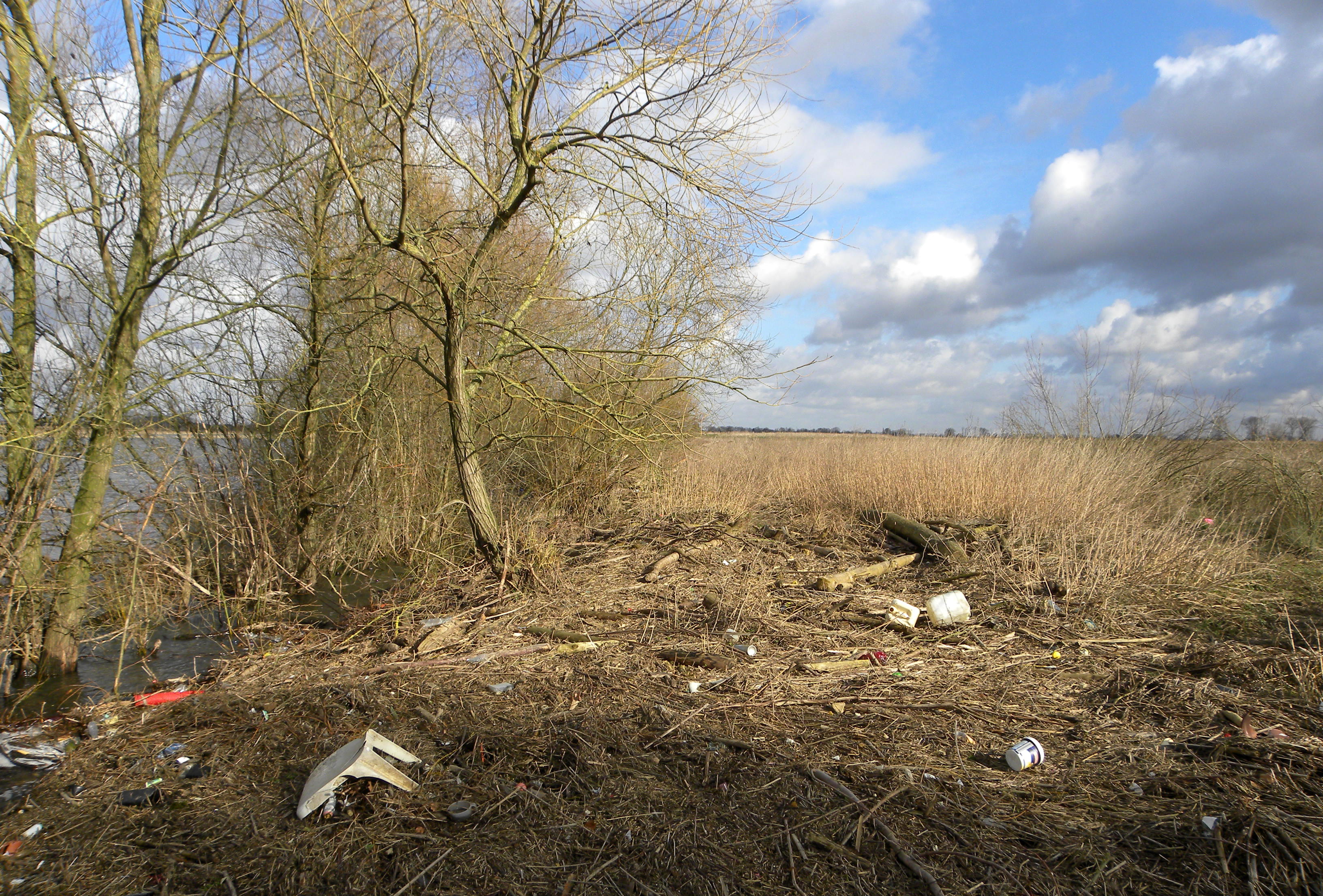Het water is veel hoger geweest dan nu, dat is te zien aan de vele rotzooi die overal ligt. Een heel lelijk gezicht en ik vraag me af wie dat allemaal gaat opruimen.