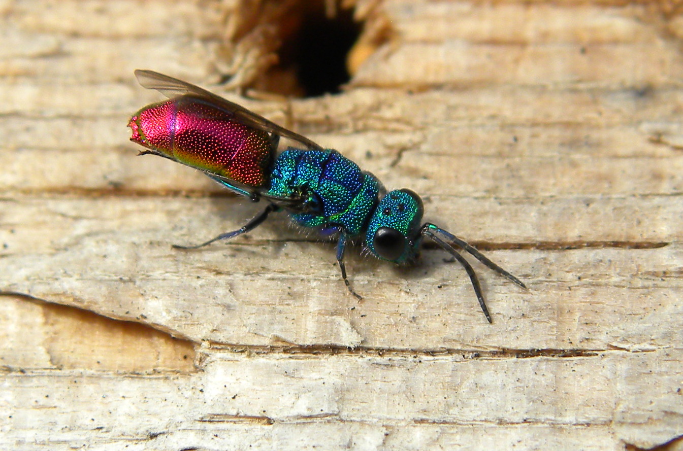 Bij mijn zeer succesvolle insectenhotel is het een komen en gaan van Rosse metselbijen maar ook de Gewone goudwesp laat zich regelmatig zien.