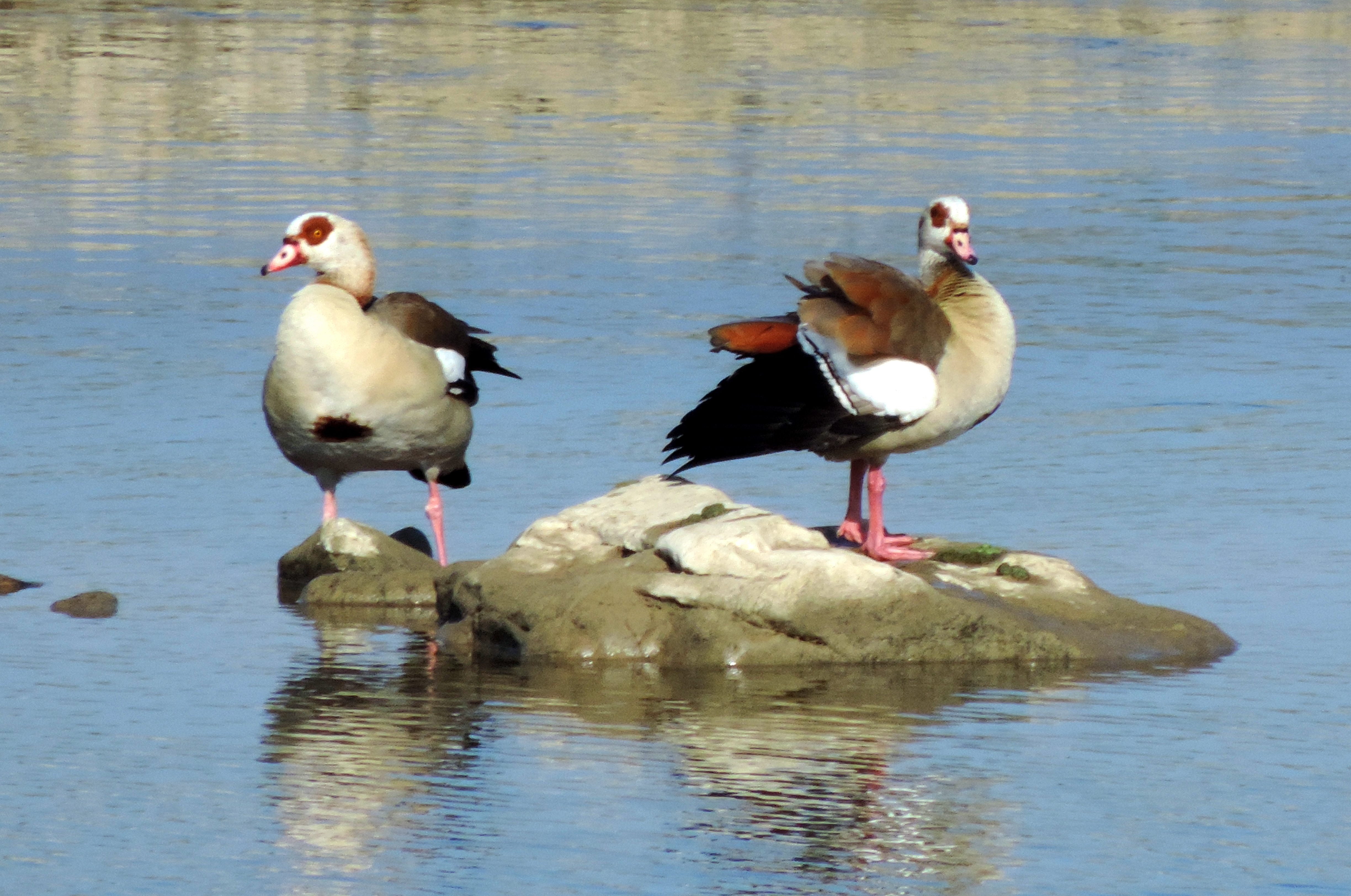 De enige vogels die ik in eerste instantie zie zijn een paar nijlganzen.