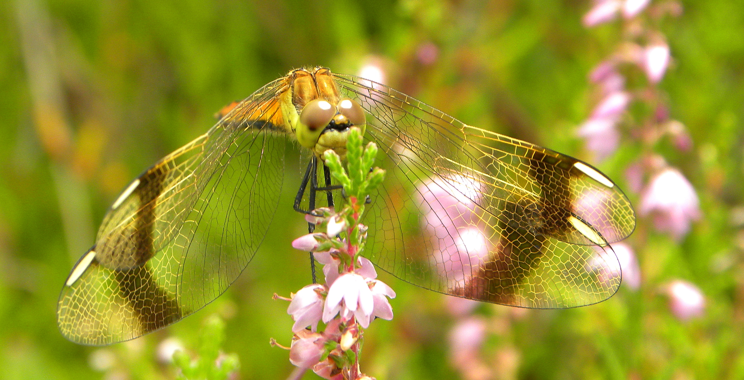 Hier hoef ik niet door het prikkeldraad te kruipen maar kan ik gewoon over een houten hek klimmen … Wel zo gemakkelijk haha. Na een paar passen is het zover … Een Bandheidelibel fladdert niet ver bij mij vandaan en landt op een plantje. Het is een vrouwtje, mooi goudgeel. Deze libellen zijn maar op een paar plaatsen in Nederland te vinden. Goede nieuws is dat deze gebieden zich wel aan het uitbreiden zijn.