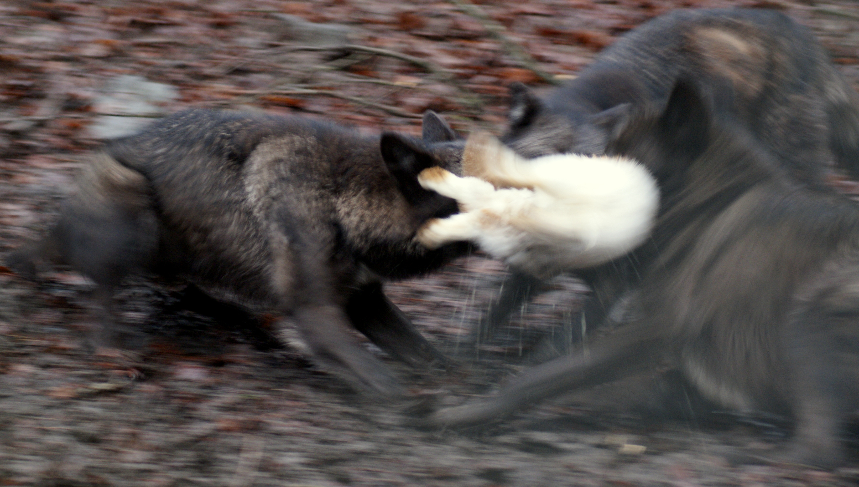 Het wolvenverblijf is een groot gebied in het bos tegen een berg met rotsen en schuilmogelijkheden. Een heel natuurlijke omgeving voor de wolvenroedel. Ik was van plan om het voeren vast te leggen op foto maar dat is toch heel anders gelopen dan dat ik mij had voorgesteld. Er wordt een aantal konijnen en wat slachtafval neergegooid en breekt een waar geweld uit van woeste beesten die zich op de prooien storten. Trekkend aan elk eind van de konijnen vechten de wolven om er een stukje van te pakken te krijgen.