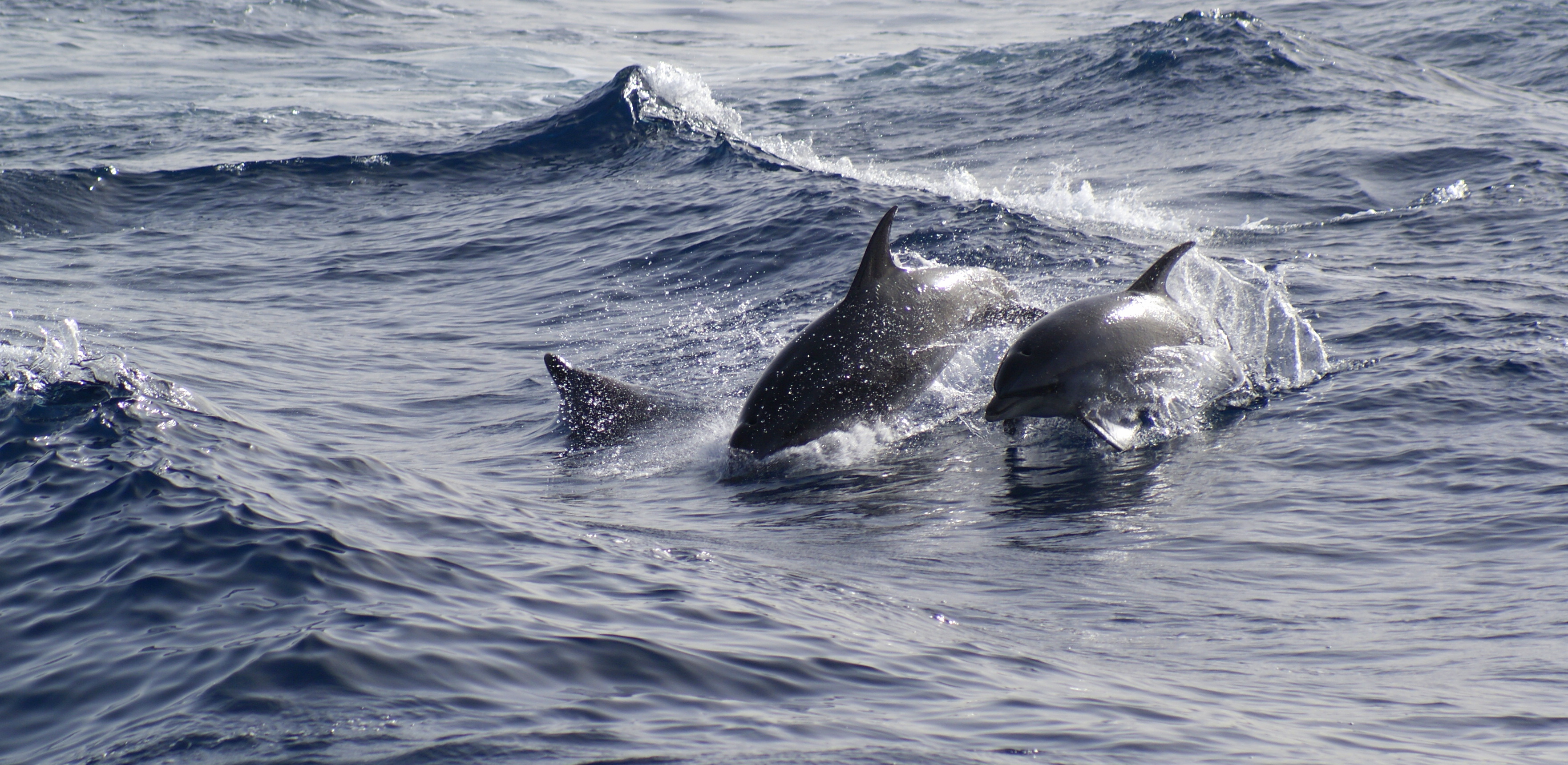 Een tijdje later zien we in de verte heel wat meer dolfijnen en deze zijn een heel stuk groter, en van een andere soort, de tuimelaar en die naam hebben ze niet voor niets. Onze boot zet koers in hun richting en met de snelheid die we maken ontstaan er hoge golven. Hét recept voor mooie plaatjes want dolfijnen vinden dit geweldig, dus gaan we “tuimelen” en nog veel meer !