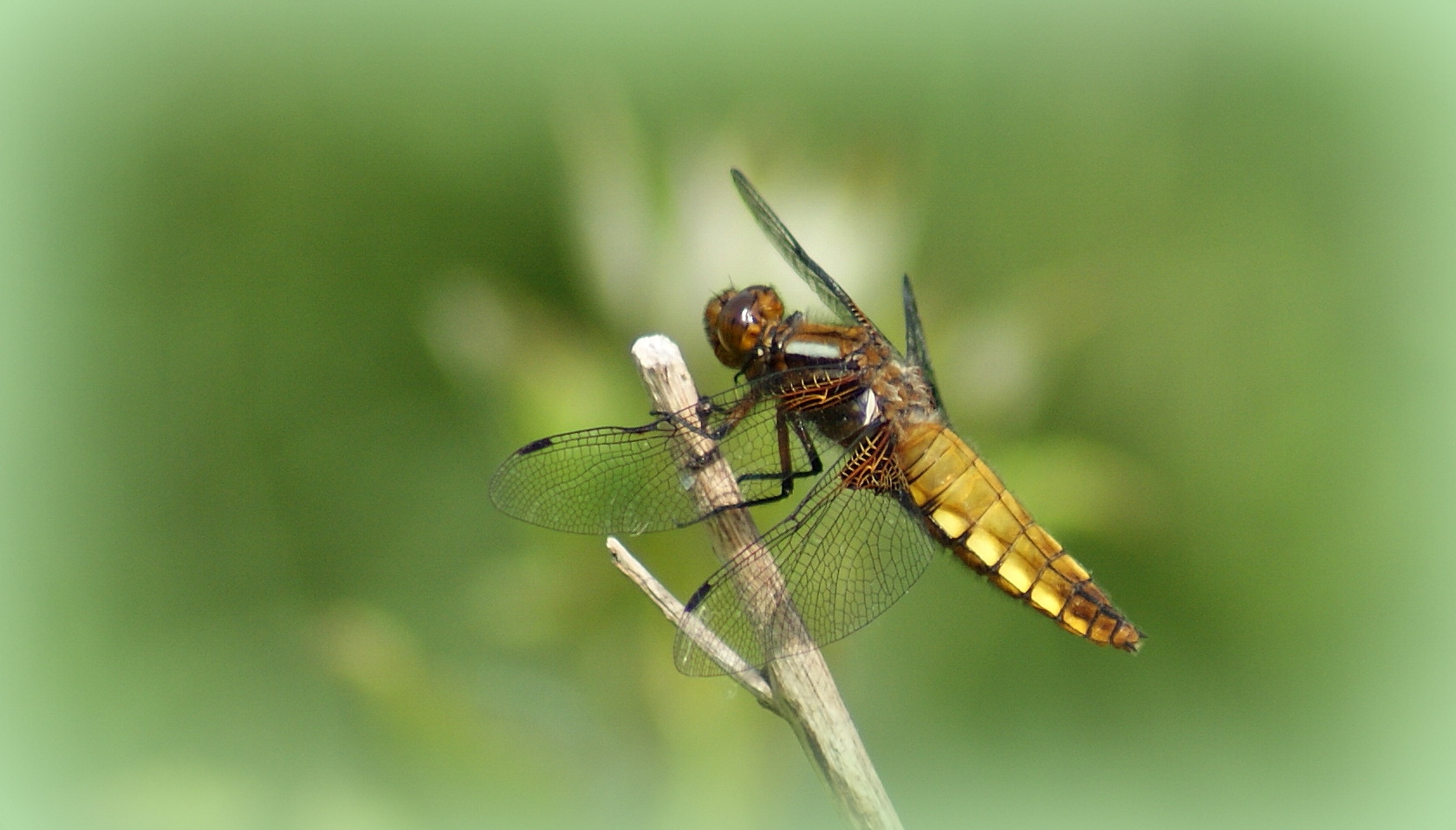 De wandeling wordt vervolgd door een ruig gebied, moeilijk te belopen, waar heel veel Meidoorn groeit. Er broeden op een haag van 30 meter wel 4 verschillende vogelsoorten. Ik hoop stiekem op een Klauwier want die zou hier goed passen … Helaas….ook mooi, maar heel wat gewoner, er zitten 3 vrouwelijke Platbuiklibellen in een struik.