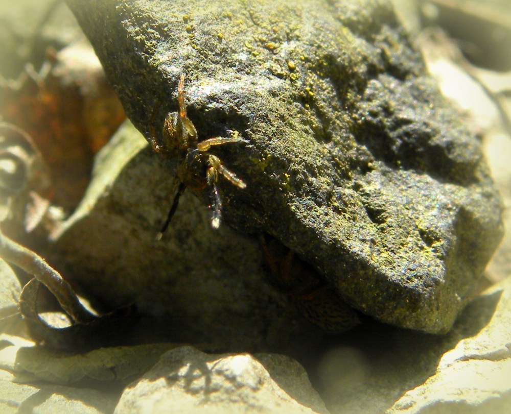 Het mannetje zwaait met zijn voorpoten. Het vrouwtje zit onder een steentje