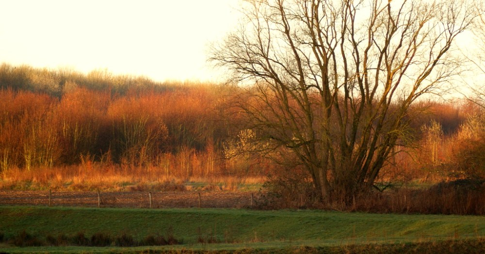 Maar in de weilanden komen de mooie ochtendkleuren door de zon weer helemaal tot hun recht.