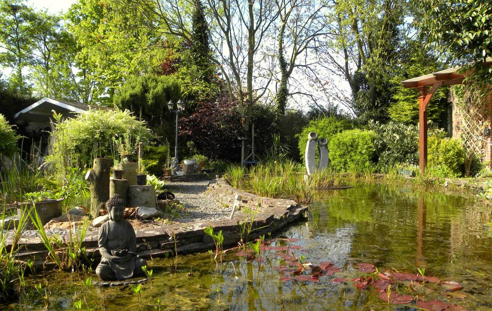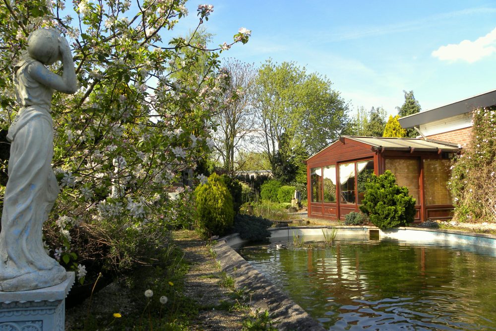 Dat heb je in deze tijd van het jaar. Met zo’n grote tuin hebben we al jaren geleden besloten om al het gras te verwijderen en een “watertuin” te creëren. Met als gevolg dat zeker 65% nu uit vijvers bestaat met rondom wandelpaden. Dit vergt een stuk minder onderhoud.