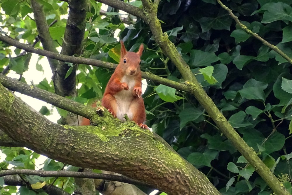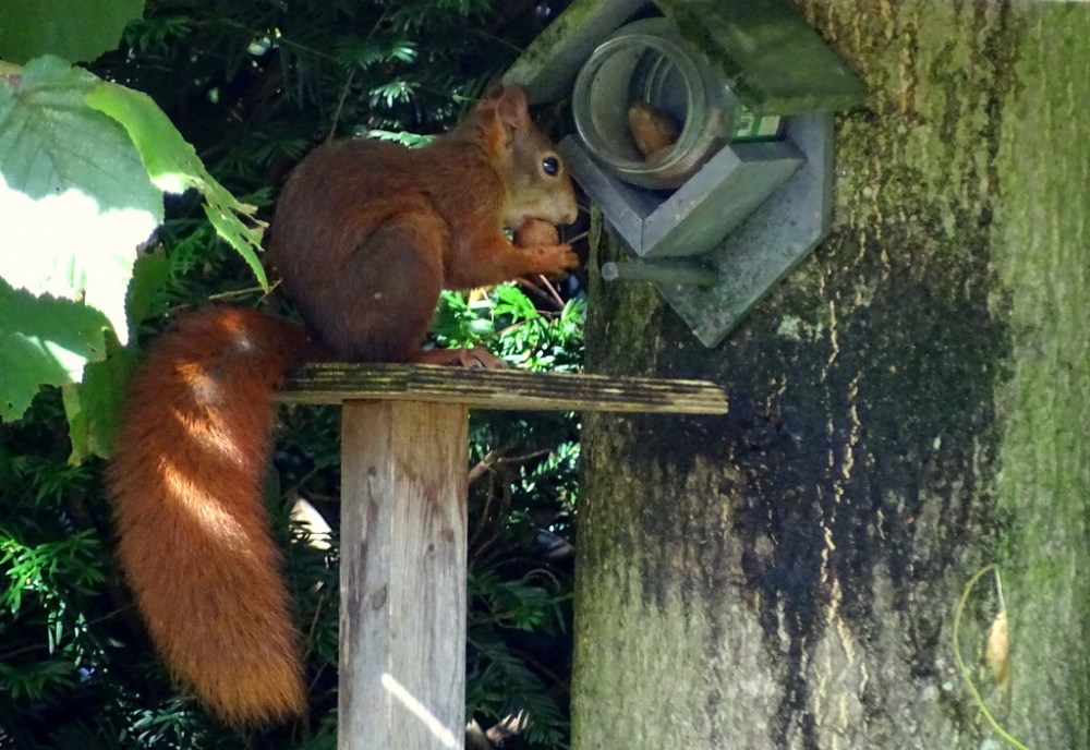 Dagelijks bezoek. Niet één maar twéé jonge eekhoorntjes komen nu constant even op bezoek in de tuin. Ben ik zelf ook buiten dan was het eerst nog eventjes nieuwsgierig afwachten tussen de blaadjes, maar langzaam aan raken ze toch een beetje gewend aan mij…
