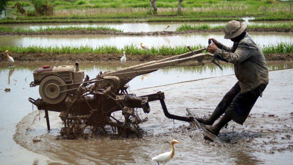 Dan gaan we op weg naar een mooie waterval, Tegenungan. We komen langs rijstvelden waar mensen aan het werk zijn met zo’n typische ploeg, de kerbau is inmiddels vervangen door een halve tractormotor of zoiets. Al vele gezien deze vakantie maar niet van zo dichtbij. Volgens mij kan die ook goed waterskiën 🙂