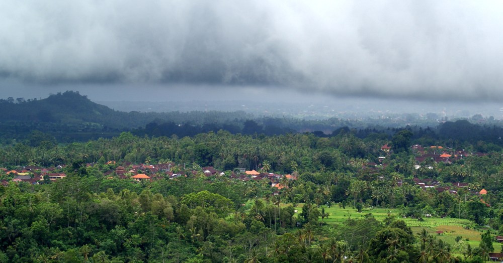 En na ongeveer drie kwartier varen komen we al aan op Bali, waar het niet al te best weer is zo te zien.