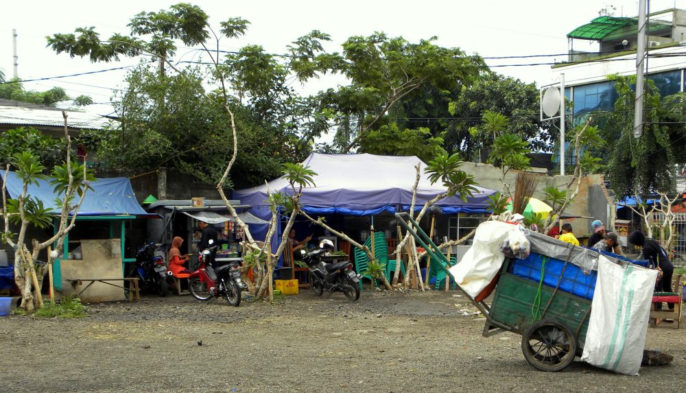 Terwijl we in de file staan zie ik op de stoep een bekend logo op iemands T-shirt, het logo van mijn werkgever Saint Gobain. Ben je in een miljoenenstad en dan zie je zomaar een Indonesische collega … Hoe bizar.