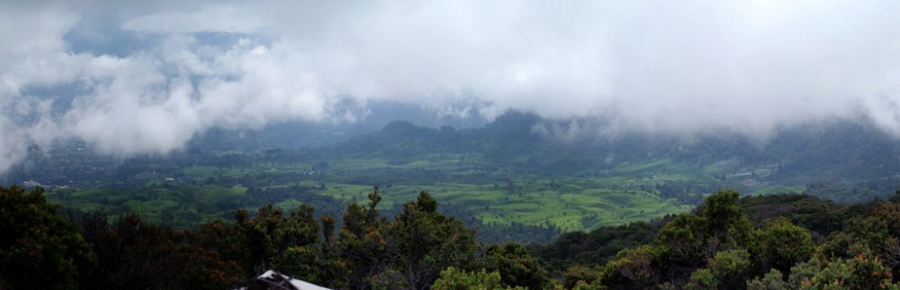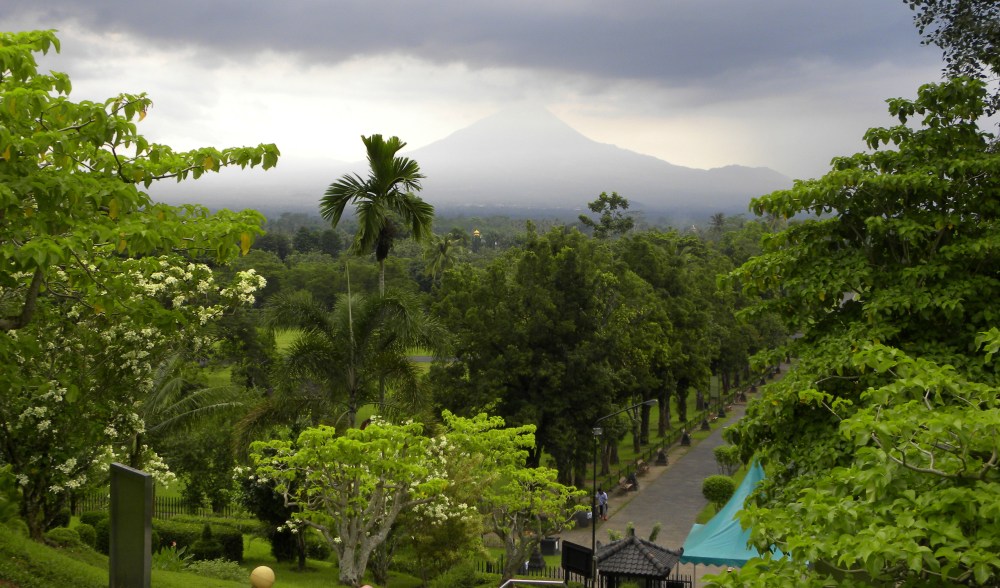 Nog even een uitzichtfoto vanaf de Borobudur, richting een vulkaan geneveld in een regenbui.