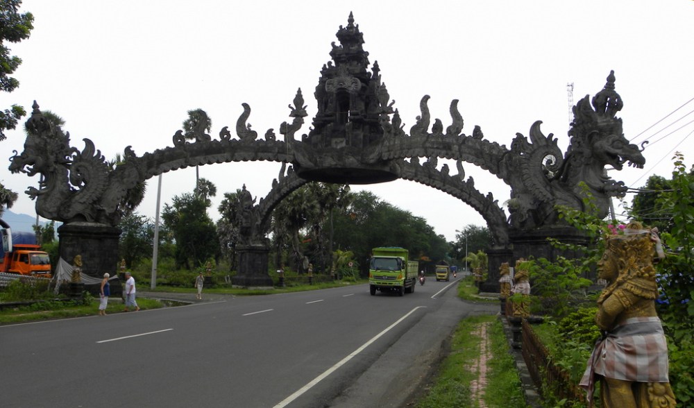 Maar gelukkig is het wel droog en na het eerste beeld van Shiva op een lotusbloem, maken we een korte stop bij de toegangspoort van Bali.
