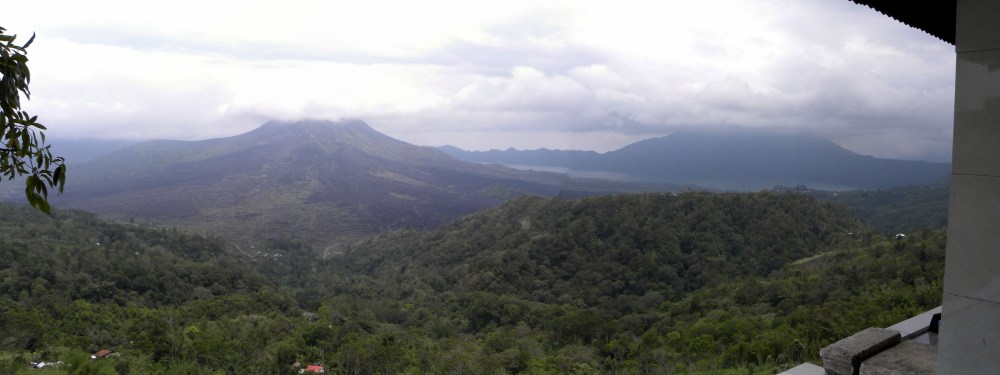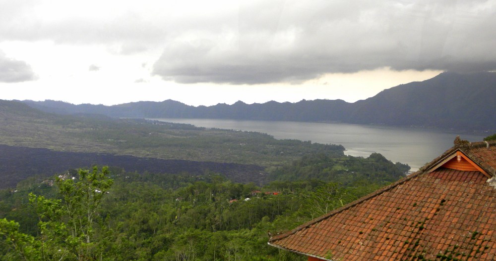 In de ochtend moeten we al weer bijtijds vertrekken. We hebben pech want de weg naar de grootste waterval op Bali is dicht door een aardverschuiving en omrijden is meteen ook heel veel omrijden. We rijden nu via Kintamani, daar gaan we eventjes winkelen en daarna lunchen met uitzicht op het Kintamani kratermeer, Lake Batur en op de achtergrond Mount Batur.