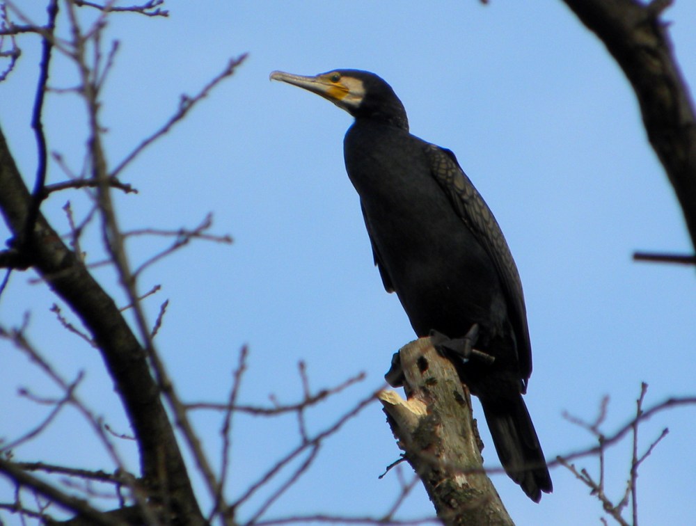 Twee sijsjes … heel leuk, maar de foto is TE slecht. In de top van een hoge boom zaten drie aalscholvers. Eentje vloog meteen weg maar de anderen bleven zitten.