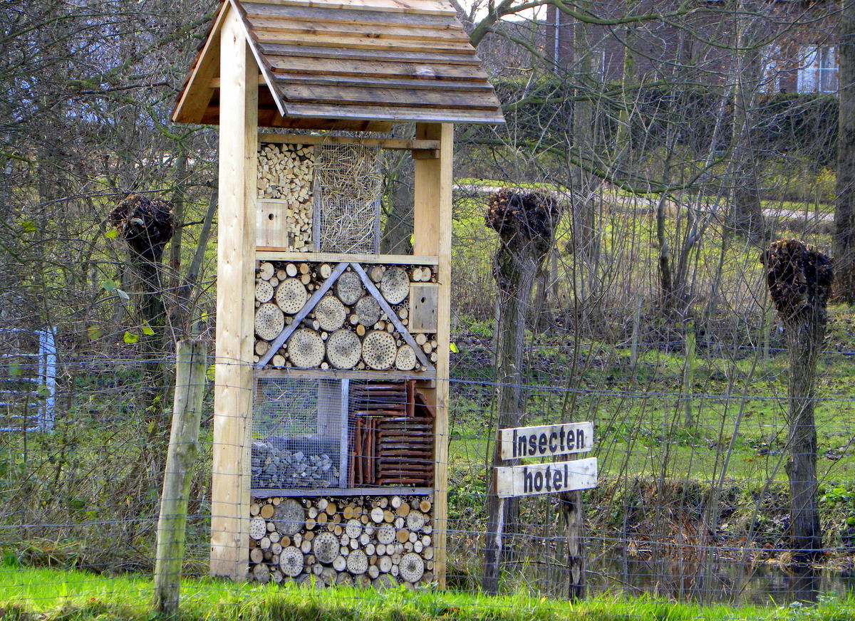 In het weiland aan deze kant van de beek zie ik opeens iets wat ik nog niet eerder gezien had. Een hotel? Hmm, hier moet ik als beestjesfreak volgend voorjaar toch eens poolshoogte komen nemen.