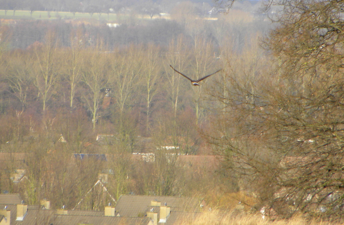 Richting de bewoonde wereld kijkend zie ik een vrouwelijke blauwe kiekendief vliegen … nog een beetje te ver weg.