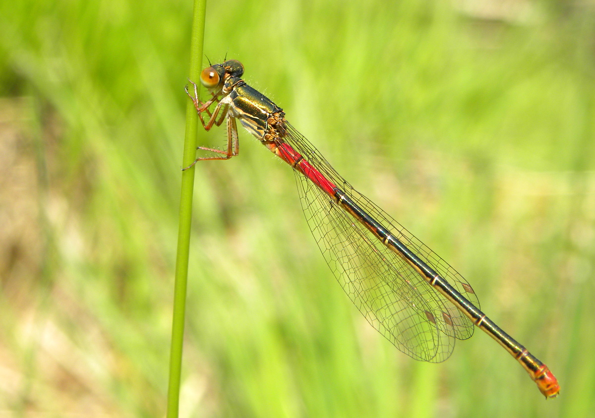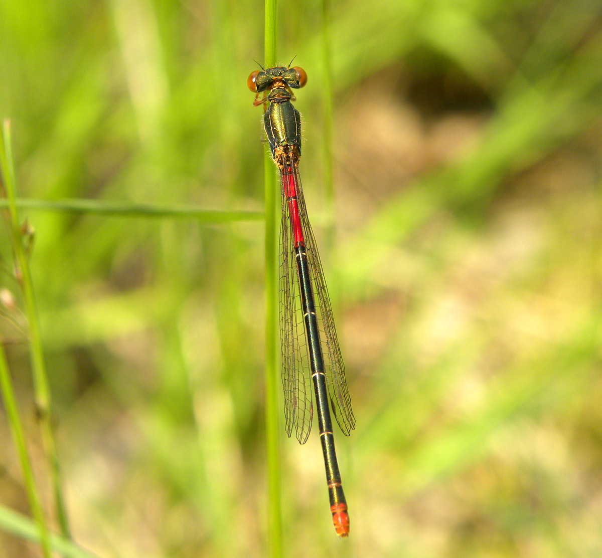 Zou het soms een soort pantserjuffer zijn? … Dat blinkend groen doet dat wel vermoeden, maar pantserjuffers hebben toch geen rood? Op waarneming.nl waren ze er al snel uit .. Doodgewone koraaljuffers. Huh? Blijkbaar zien die er zo uit als ze nog niet zijn uit gekleurd.