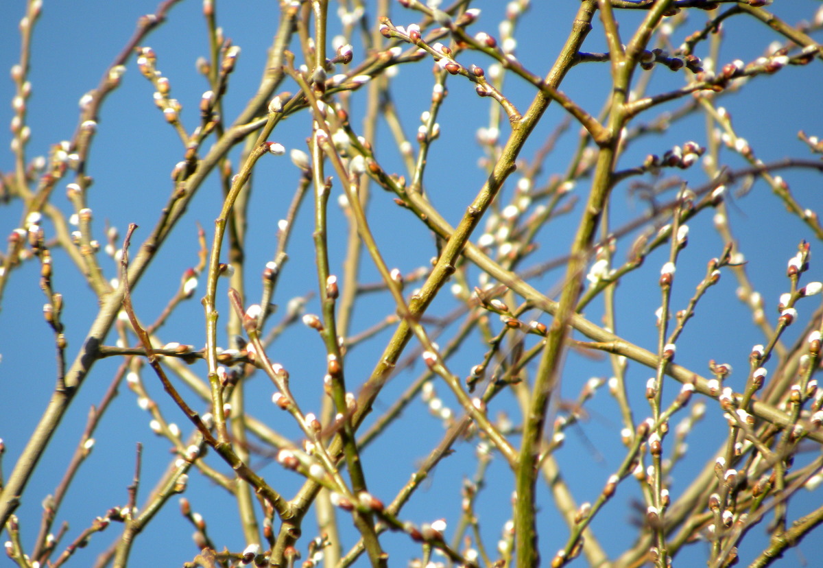 De katjes schieten uit, mooi in de zon tegen een fel blauwe lucht.