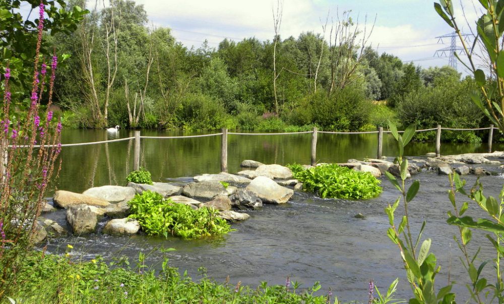 De wandeling gaat verder over een stukje stapstenen om de plas op zijn smalste stukje over te steken. Sommige stenen liggen iets onder water wat een beetje oppassen is om dan niet uit te glijden, lijkt wel of de Romeinen even zijn teruggekeerd om dit aan te leggen 🙂