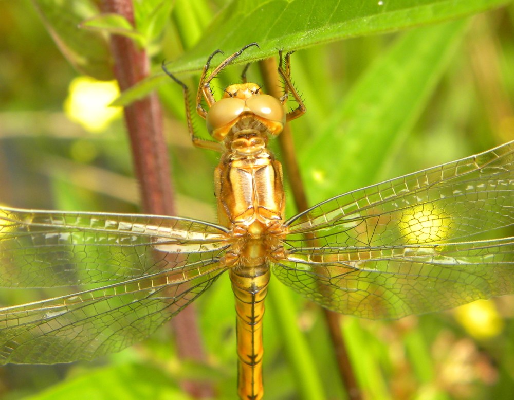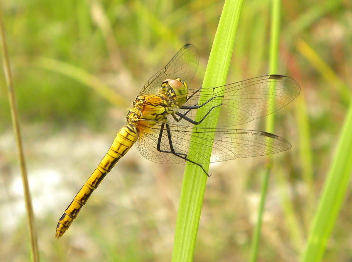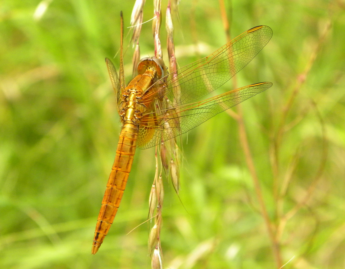 Ik zie een goudgekleurde libel neerstrijken in het hoge gras … Wederom een Roodbruine Heidelibel, deze keer een vrouwtje.