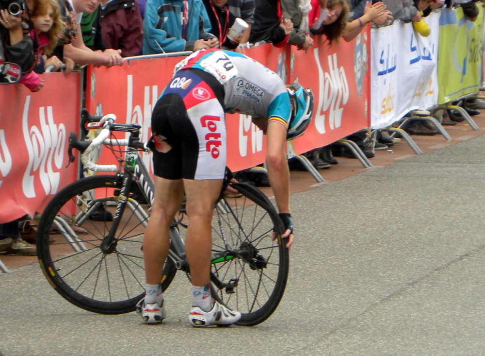 Jurgen Roelandts zat klaar om de sprint in te gaan, bij de voorste renners …. maar ja, het was voorbij. Zijn band was eraf en kon niet eens meer finishen.