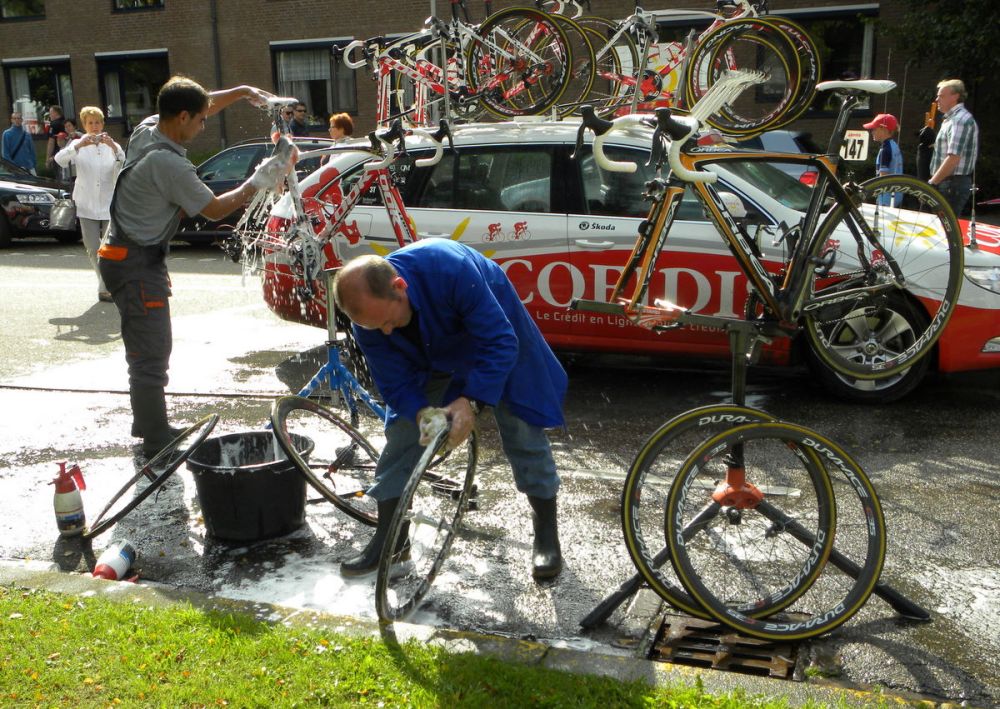 Terwijl de heren gehuldigd werden waren “de mannetjes achter de schermen” al druk doende om alle fietsen uit elkaar te halen en te boenen, schrobben en wrijven.