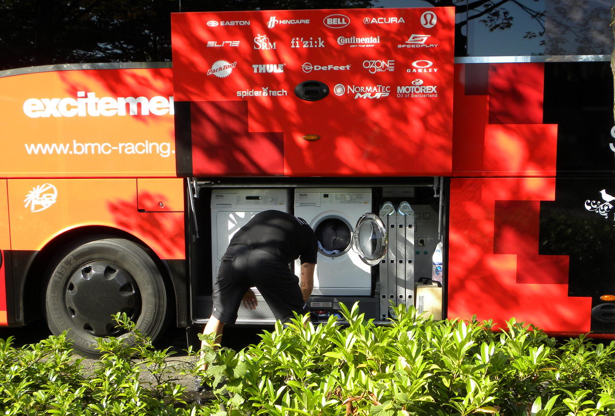 Ook de was werd meteen in de machine gestopt … in de bus